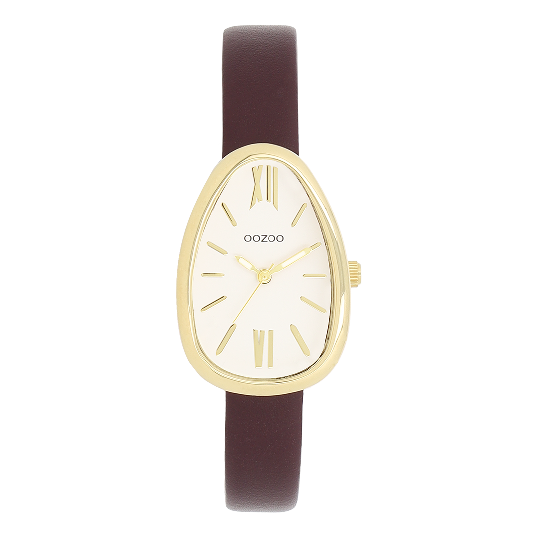 Stand out with this beautiful egg-shape ladies design from the trendy OOZOO Timepieces collection. The C11635 has a fig red leather strap and 31x22 mm gold coloured metal watch case. You are making quite the fashion statement with this white dial, gold coloured stripes and Roman numerals digits and matching hands. This essential watch for your wardrobe has a mineral glass, stainless steel backplate and is nickel safe. This watch has a 2ATM Japanese movement and is covered by a 2 year warranty (see section 3 of our Refund, shipping & warranty policy).