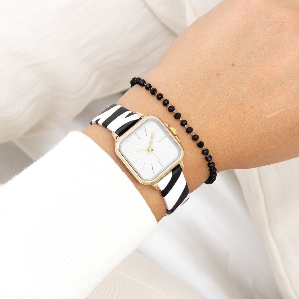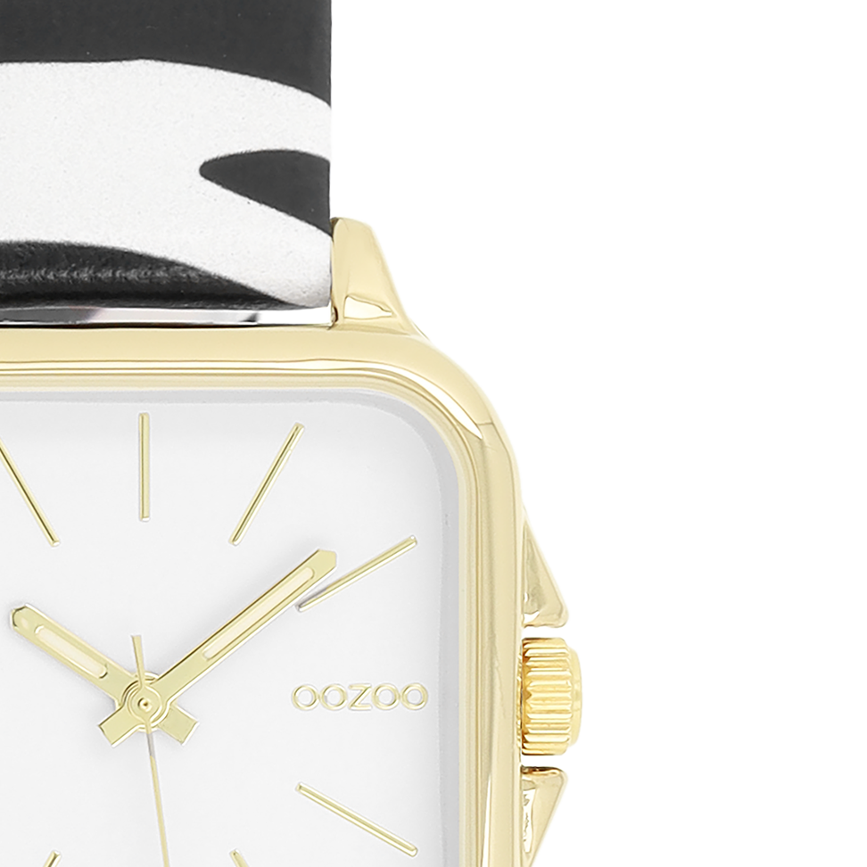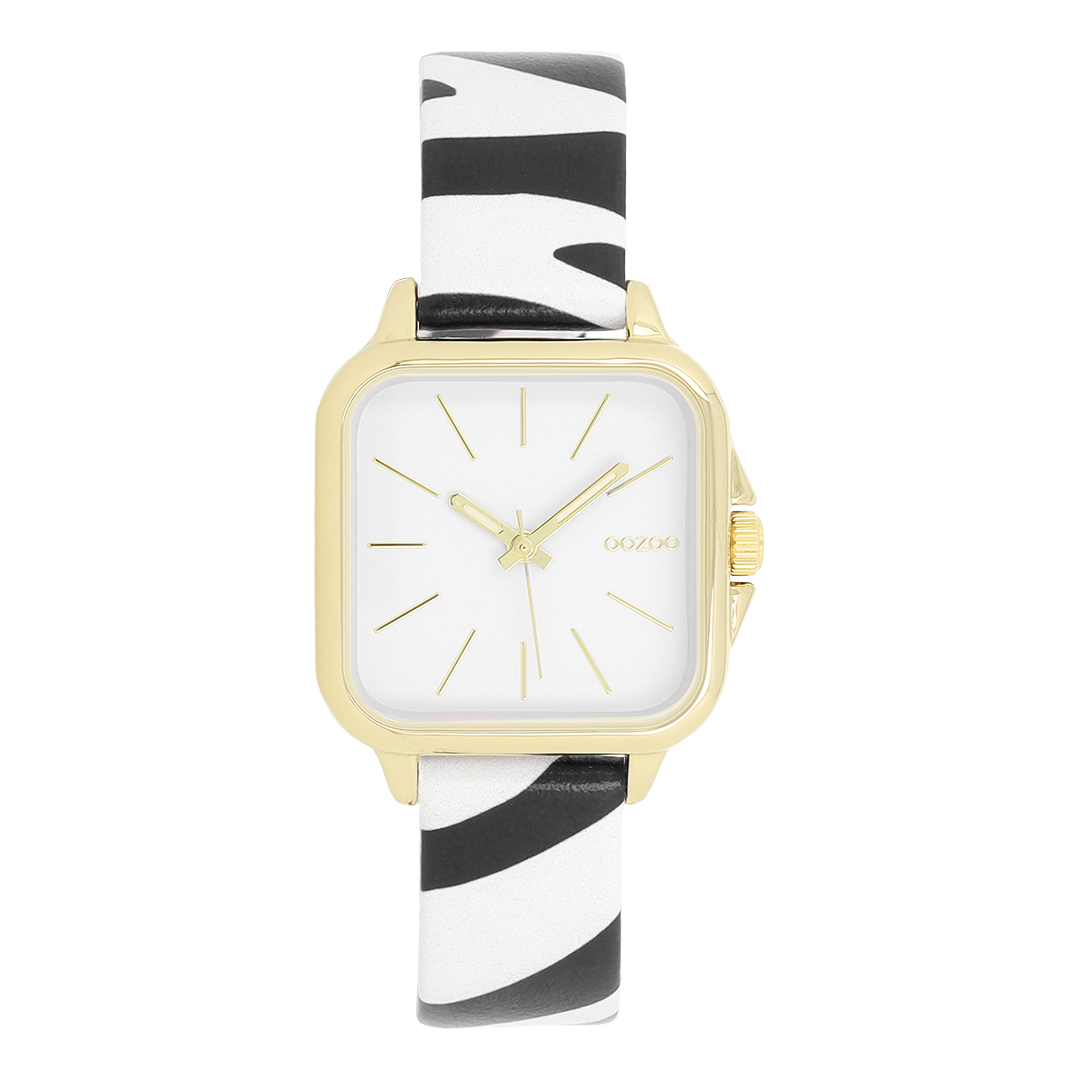Stand out with this beautiful square ladies design from the trendy OOZOO Timepieces collection. The C11610 has a zebra print black/white leather strap and 34 mm gold coloured metal watch case. You are making quite the fashion statement with this white dial, gold coloured stripes digits and matching hands. This essential watch for your wardrobe has a mineral glass, stainless steel backplate and is nickel safe. This watch has a 2ATM Japanese movement and is covered by a 2 year warranty (see section 3 of our Refund, shipping & warranty policy).