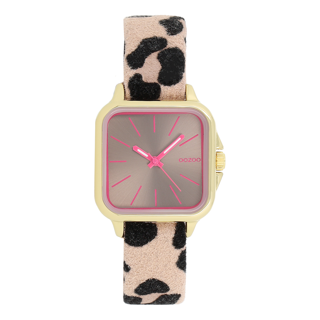 Stand out with this beautiful square ladies design from the trendy OOZOO Timepieces collection. The C11611 has a leopard print brown/black leather strap and 34 mm gold coloured metal watch case. You are making quite the fashion statement with this taupe sunray dial, fluo pink stripes digits and matching hands. This essential watch for your wardrobe has a mineral glass, stainless steel backplate and is nickel safe. This watch has a 2ATM Japanese movement and is covered by a 2 year warranty (see section 3 of our Refund, shipping & warranty policy).