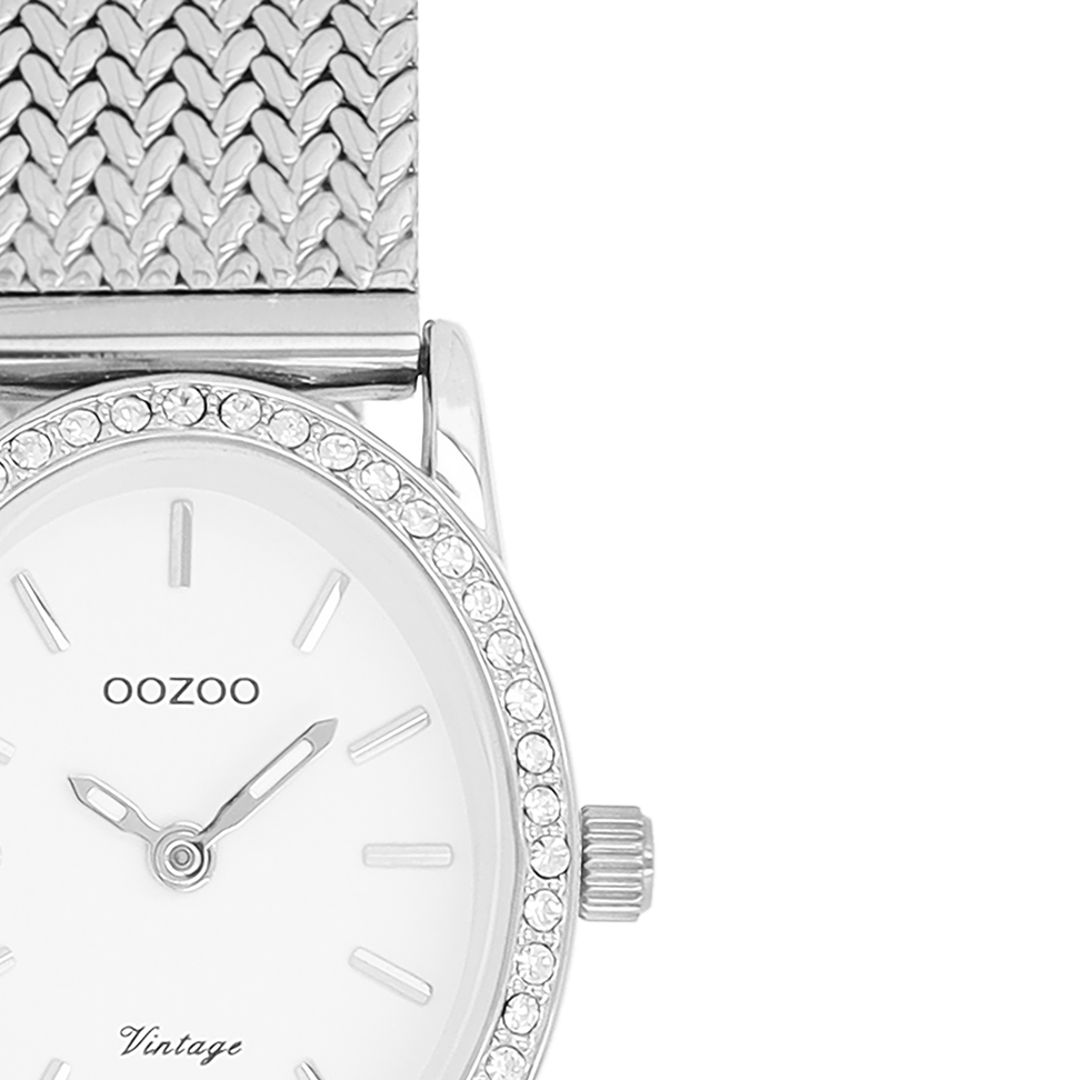 The classic look stays key in this trendy series and therefore, this oval OOZOO vintage design with a playful wink is the season must-have! This ladies watch is the perfect combination of fashion and comfort with its 28x23 mm silver coloured metal with crystals watch case and white dial. The silver coloured metal v-mesh bracelet makes this watch a trendy accessory, which you can wear every day. The dial has silver coloured stripes digits and matching hands. The C20430 adds the sparkle to your outfit. The mineral glass lays in a mm slim metal watch case with IP-plating. This design has a stainless steel backplate and is nickel safe. This watch has a 2ATM Japanese movement and is covered by a 2 year warranty (see section 3 of our Refund, shipping & warranty policy).